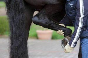 26.04.2018, Wardow, Mecklenburg-Vorpommern, GER – Beugeprobe am Hinterbein eines Pferd.