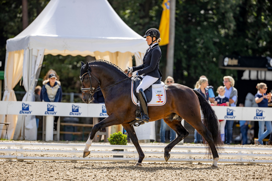 Carolina Miesner und der 5-jährige Junghengst Melli’s Glückskeks (Golden West x Golden Dancer) sicherten sich den Sieg der 5-jährigen Dressurponys mit einer Wertnote von 8,9. Die Reiterin wurde auch mit dem Tierschutzpreis des Bundesministeriums für Ernährung und Landwirtschaft belohnt.