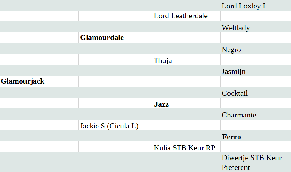 Es handelt sich um den bekannten Daula Stamm Merrielijn 31 und der Züchterfamilie 20. Der Stamm hat einen Zuchtwert von 160!